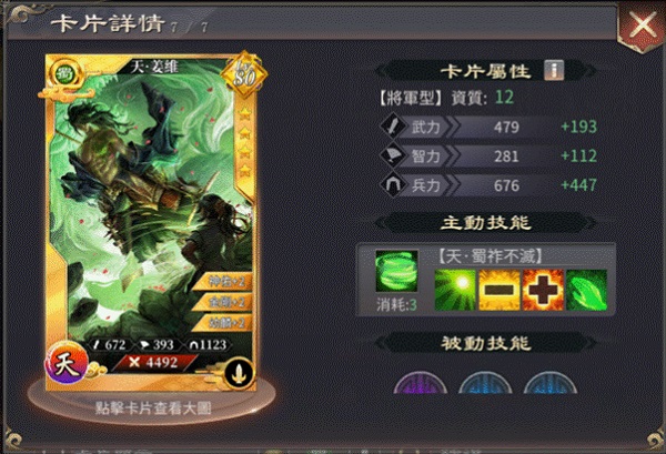 戰神關羽可以無視兵種克制效果,提供魏國、蜀國的加成,主動技能可以提升全體槍兵的物攻物防,是槍兵隊不可或缺的角色!