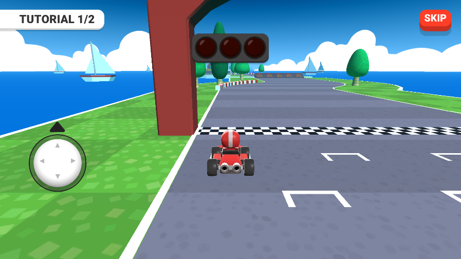 2、左側的方向盤可操控賽車移動,當上方紅燈變綠時,即可開始賽車