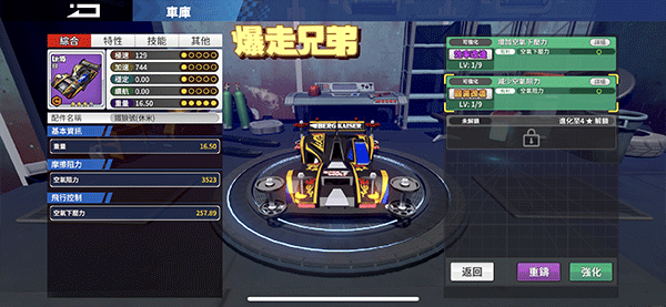 你可以把底盤升級并進化到一星,點出「避震處理」的技能。或者也可以在車輛第二擴展位安裝平衡桿,這樣釘釘的欄位便會開啟,把各式釘釘裝入就能大幅增加避震。