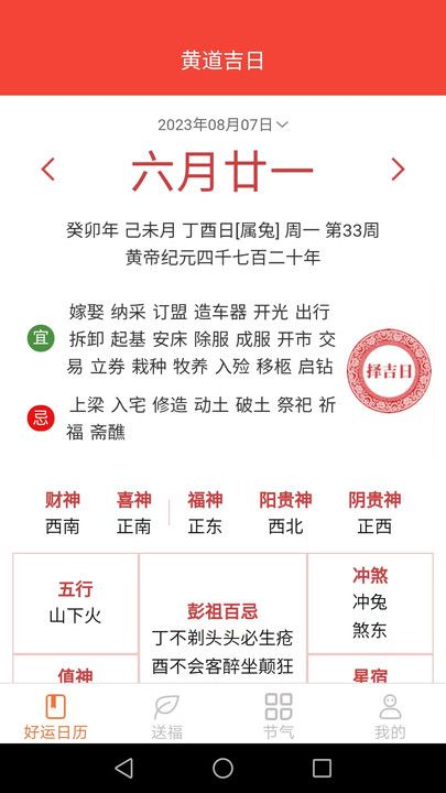 多寶好運來app官方版是一款基于黃歷,為用戶提供多種生活實用信息和日歷服務的應用程序。除了提供每日吉兇、黃歷宜忌、農歷查詢等實用功能外,還包含熱點新聞、星座運勢等多種功能,幫助用戶隨時了解生活的最新情況。