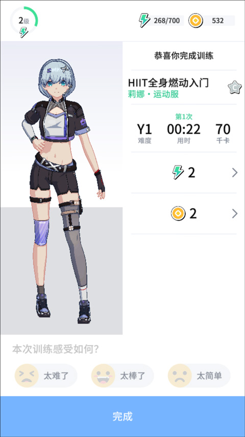 訓練完成了,教練也會夸獎你,你真棒,可以查看消耗的時間,難度、以及大卡的數量