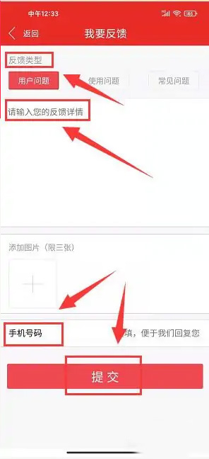 進(jìn)入我要反饋頁面,選擇反饋類型、輸入反饋內(nèi)容、手機(jī)號(hào)碼,點(diǎn)擊【提交】。