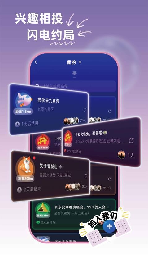 用戶可以通過該軟件找到志趣相投的人進行活動,如一起看電影、打麻將等。