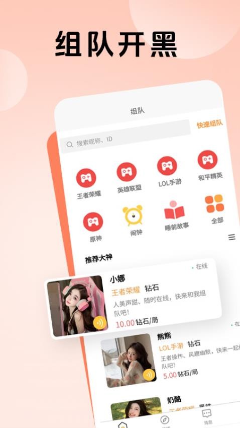 熊熊組隊App是一款擁有獨特全新游戲開黑和組隊社交娛樂功能的應用程序。它提供了非常簡便且實用的游戲互動社交方式,讓用戶能夠享受全新的簡易開黑娛樂體驗。通過開啟更多的有趣內容和玩法,每天都能自由加入各種新游戲房間,享受更多輕松愉快的游戲社交互動。在熊熊組隊的最新版本中,社交活動豐富多樣,帶來更多獨特的參與樂趣;該平臺由北京安狐科技有限公司專門為用戶設計開發,作為一款全新的社交娛樂戀愛工具。對此軟件感興趣的朋友們千萬不要錯過,趕快到本站下載體驗吧。